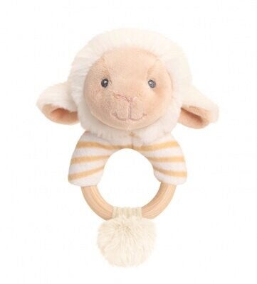 Schattige rammelaar met houten bijtring voor de allerkleinsten in een mooie zachte kleur.